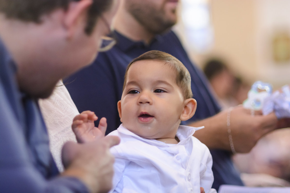 Esse pequeno príncipe lindo das fotos a seguir recebeu o sacramento do batismo em uma linda cerimônia junto com seus pais, padrinhos e familiares. Ficou bonzinho o tempo todo, quase dormiu, mas se divertiu com a movimentação toda da cerimônia de batizado!